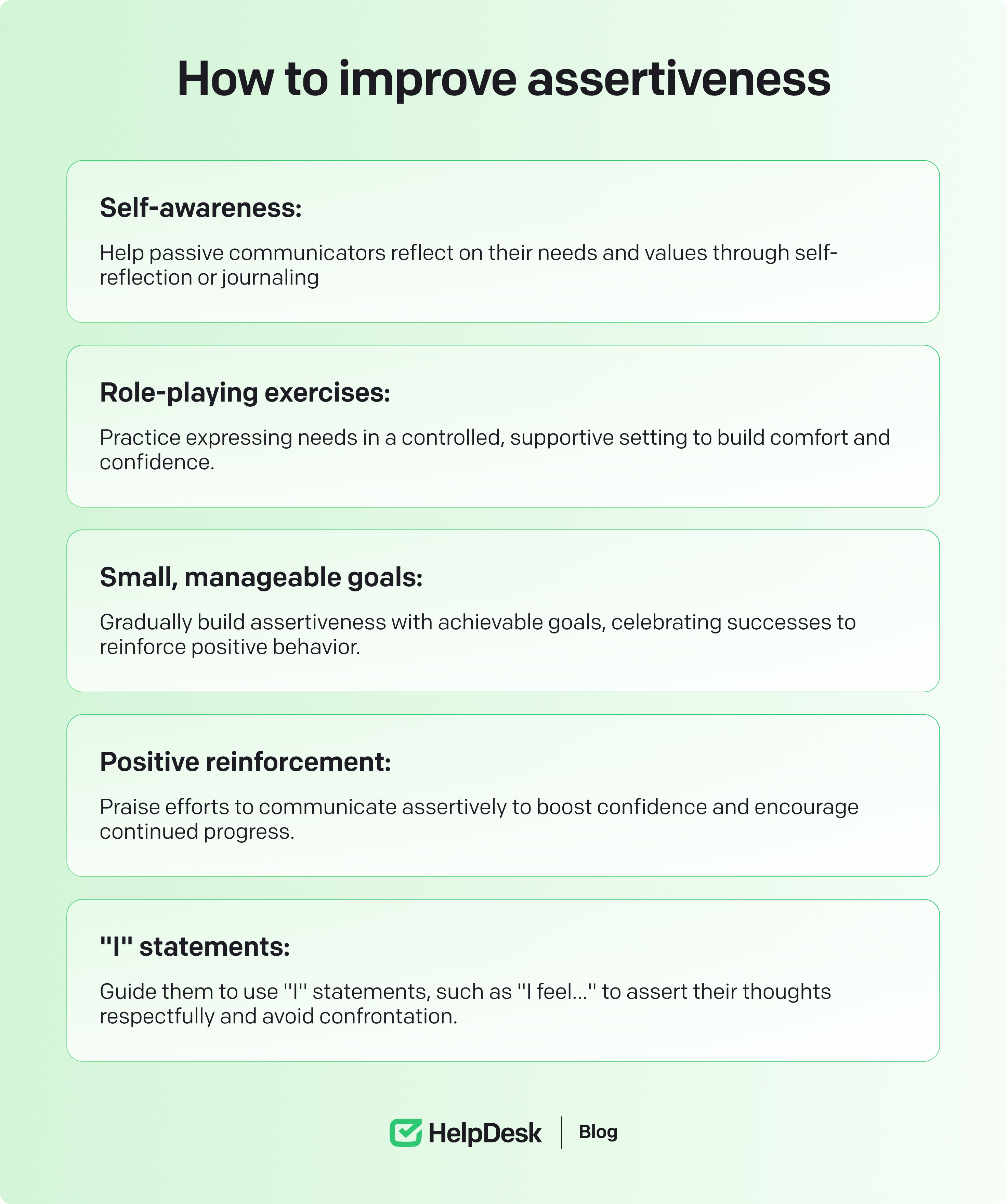 Handling conflict: When disagreements arise, assertiveness helps defuse tension by focusing on facts rather than emotions. Using “I” statements like “I feel…” instead of accusations allows for expressing feelings without blaming others, leading to more productive resolutions.