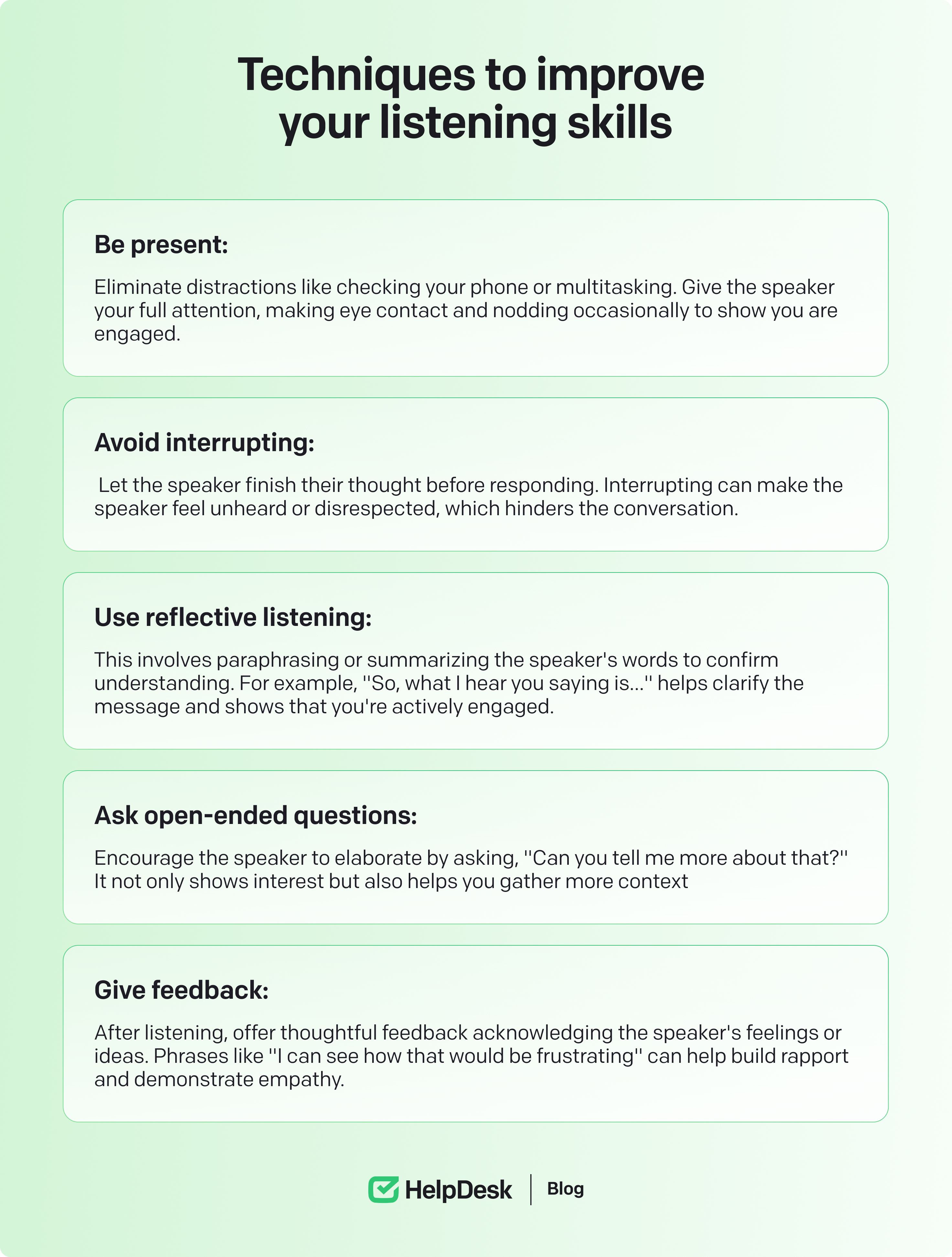 Check for understanding: After delivering your message, ask if the recipient understands. You can ask questions like, “Does that make sense?” or “Is there anything I can clarify for you?”