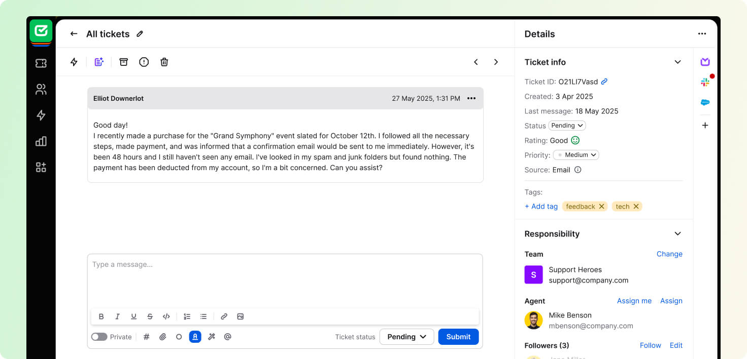 HelpDesk incorporates sentiment analysis to gauge the emotional tone of customer conversations and interactions. By identifying positive, negative, or neutral sentiments, businesses can proactively address issues, recognize loyal customers, and improve overall service quality.