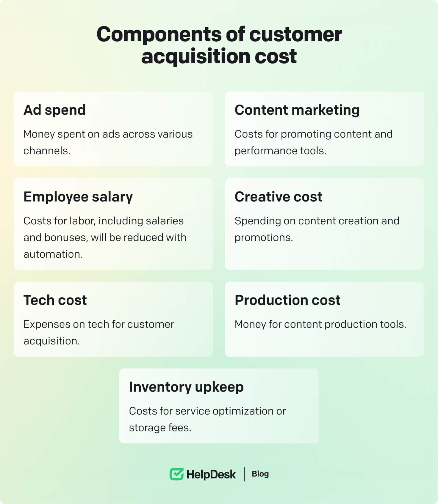 Tech cost. The cost should be included in your CAC when technology is used to acquire new customers, like in content production, website development, progress tracking, and customer support services.