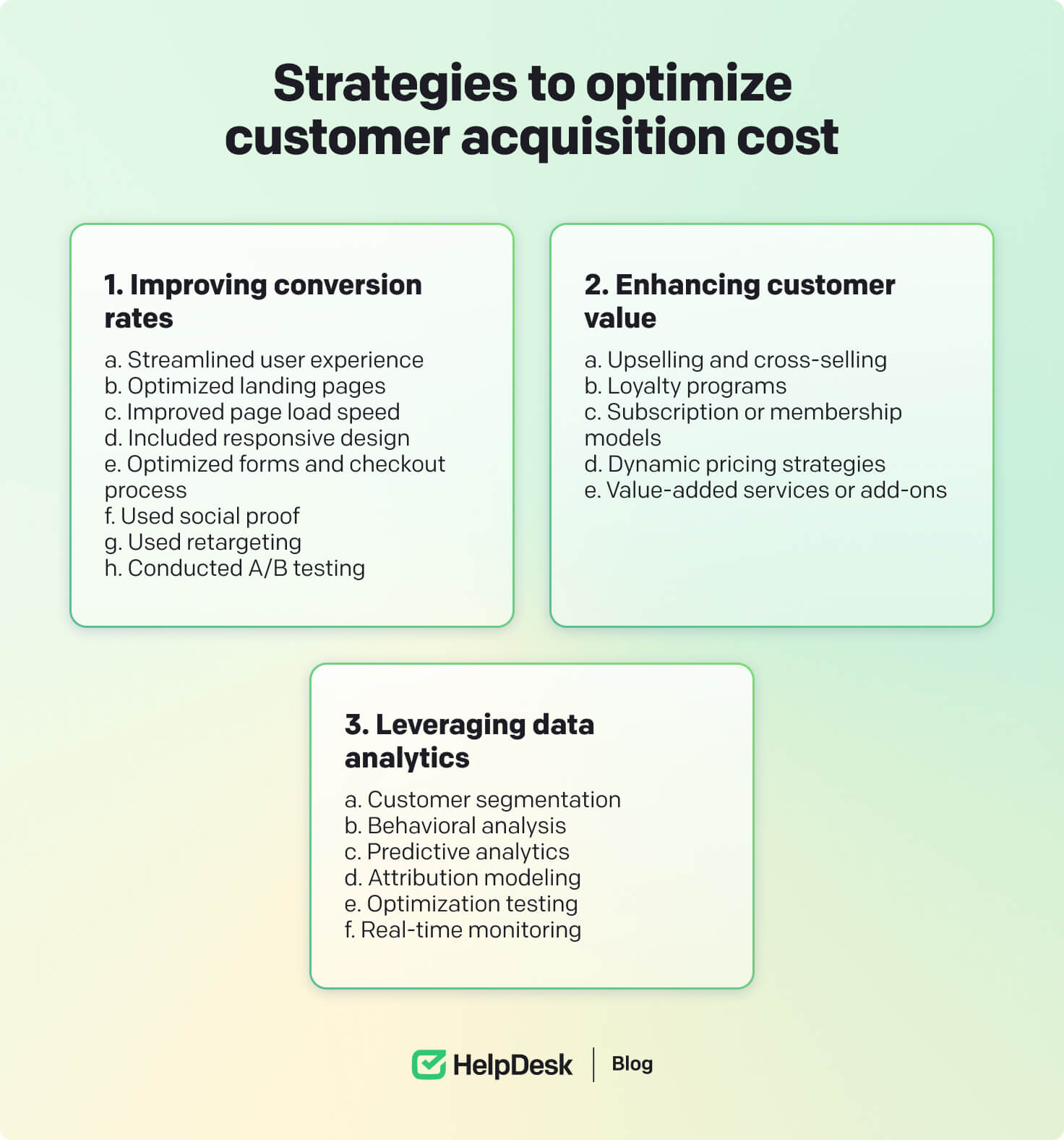 Optimize budget allocation. Allocate resources based on the performance of acquisition channels and campaigns. Shift the budget towards high-performing channels and reallocate resources from underperforming channels.