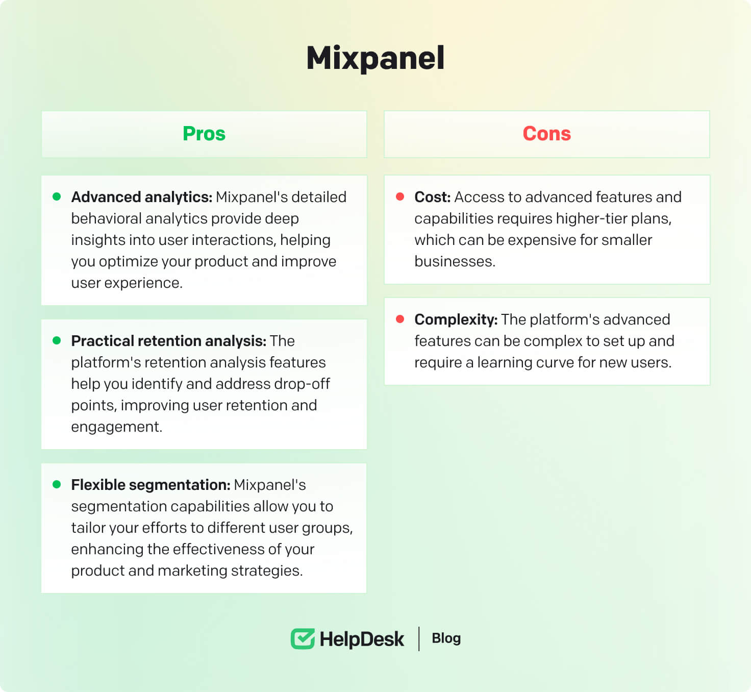 Behavioral analytics: Mixpanel tracks user behavior and provides detailed analytics on how users interact with your product, helping you understand what drives engagement and retention.