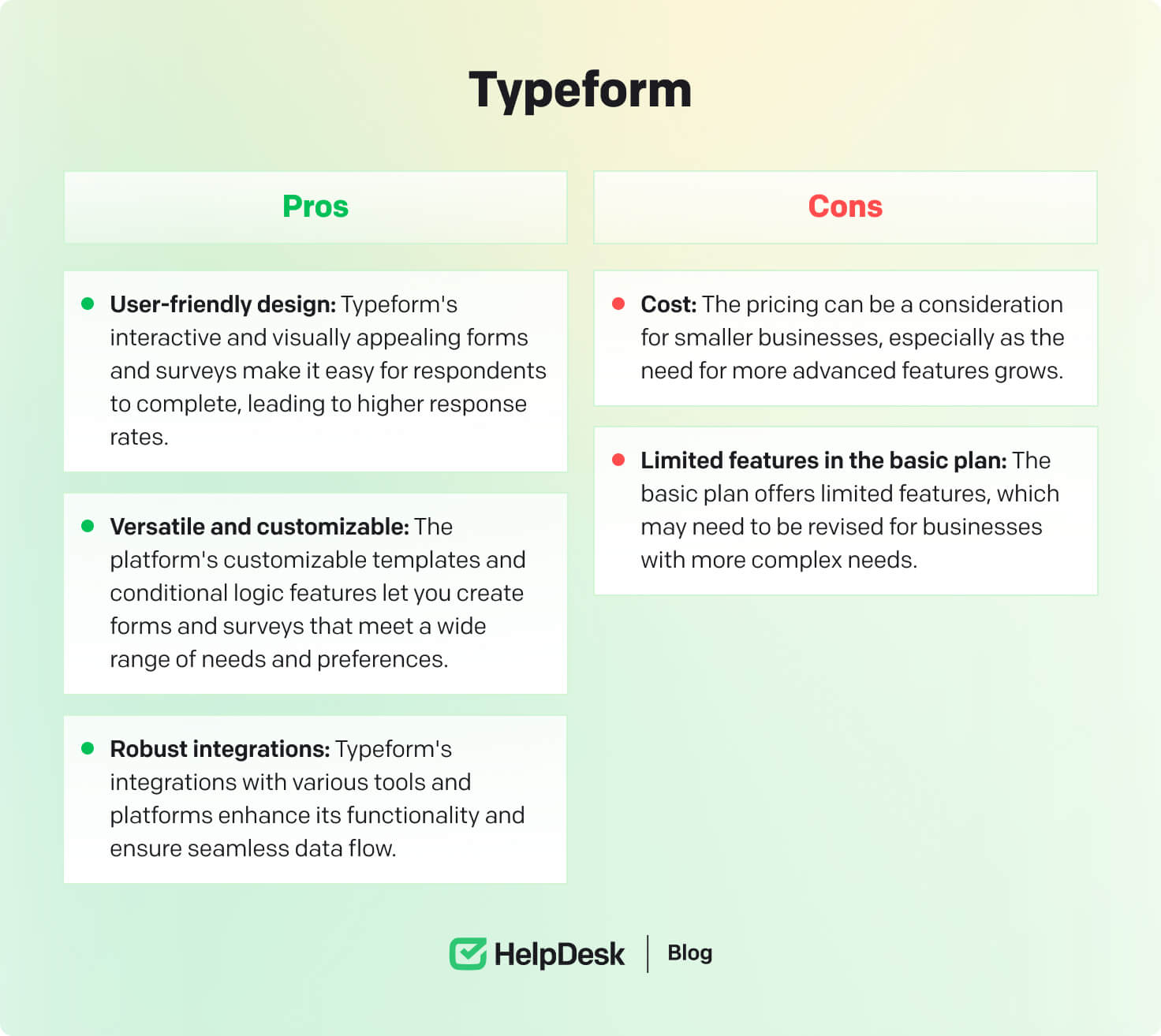 Integrations: Typeform integrates with various tools and platforms such as Google Sheets, Slack, and Mailchimp, enhancing functionality and ensuring seamless data flow across your systems.