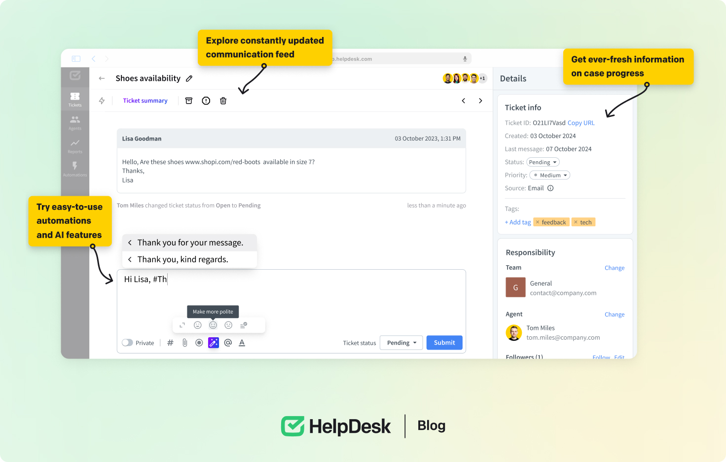 HelpDesk’s automation features can optimize the process of collecting and analyzing feedback. HelpDesk improves the efficiency of your support operations by automating repetitive tasks and directing input to the appropriate departments. The feedback collection features of HelpDesk are precious as they enable systematic gathering and analysis of customer feedback, leading to more informed decision-making and continuous improvement.
