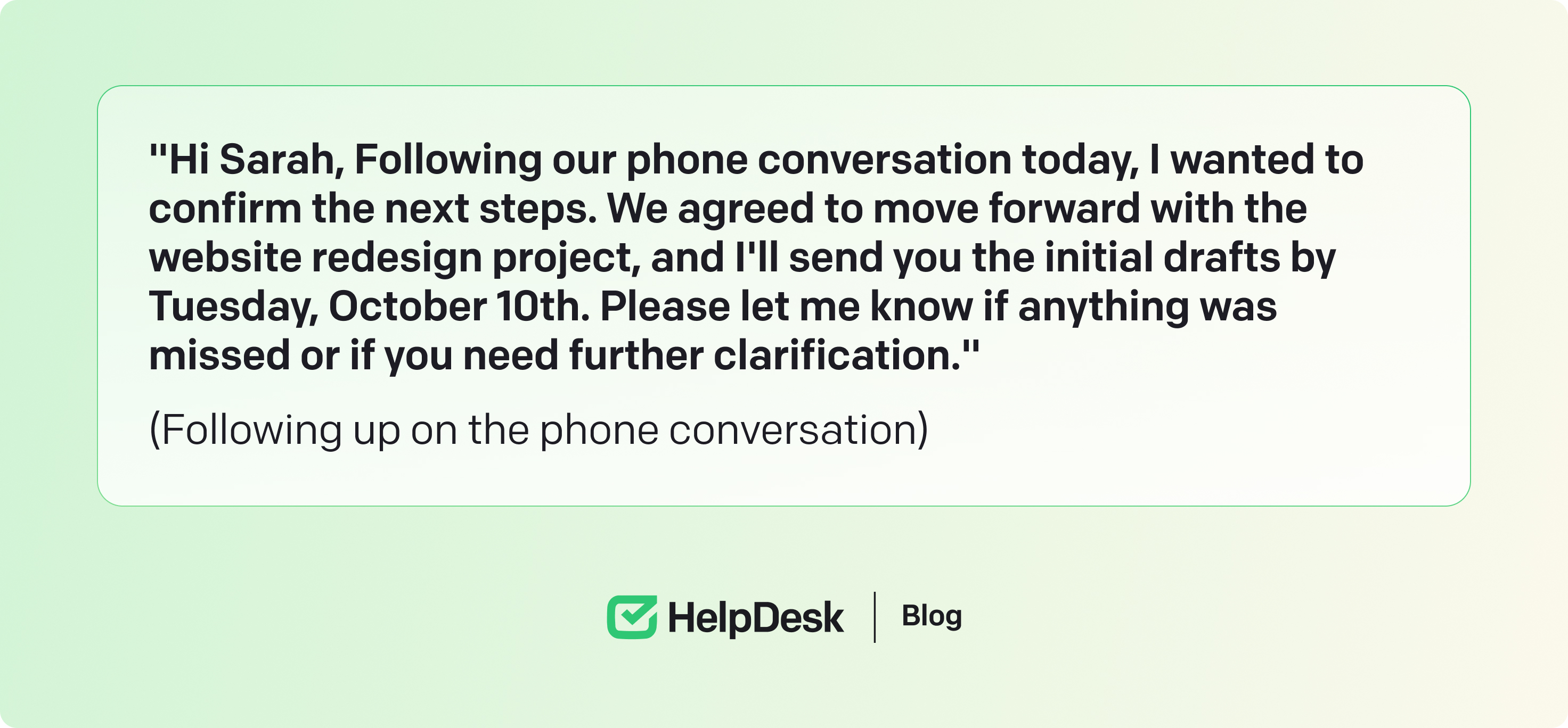 After a critical phone conversation, especially with a colleague or potential lead, it’s an important single-email etiquette to reiterate those points in the email. It helps clarify misunderstandings and ensure everyone is on the same page, leading to company success. A good example of reiterating phone conversations is: