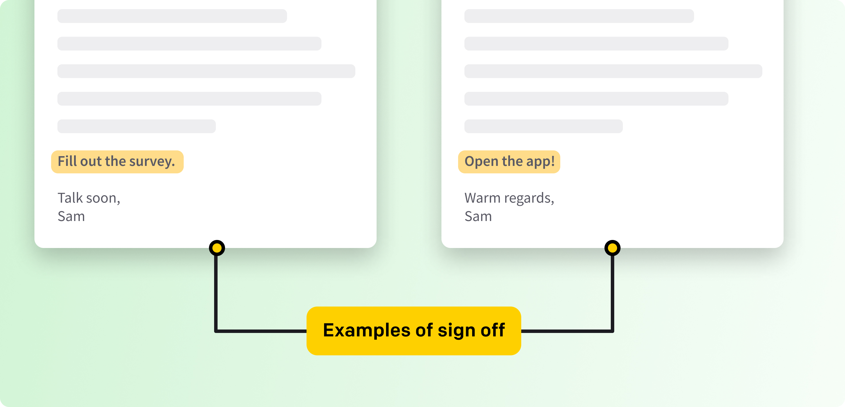 Like greetings, concluding your email with proper sign-offs is integral to email etiquette. When you use a sign-off, you give the recipient an indication that you have completed your request and also give off a professional vibe.
