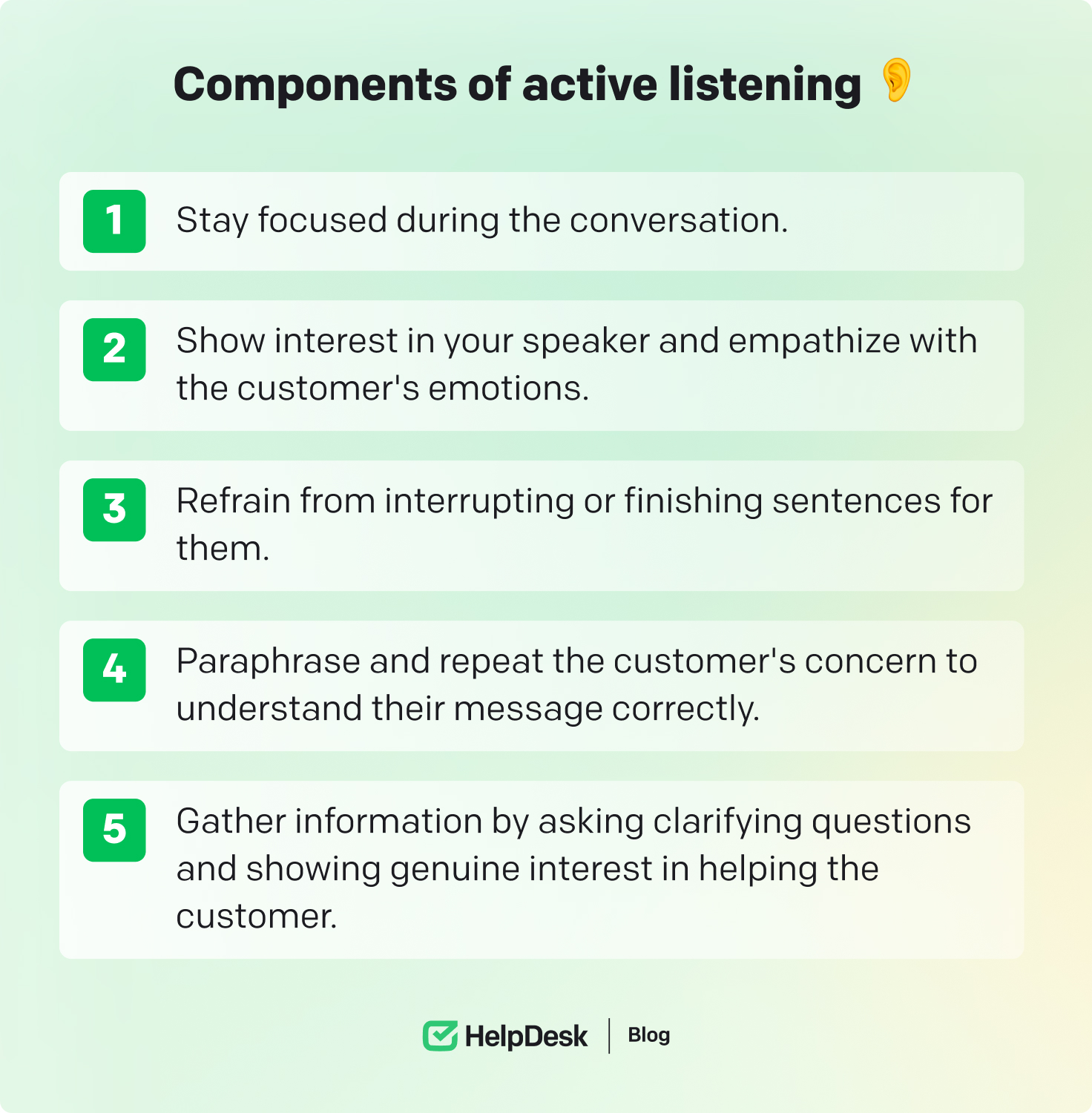 Customers aren’t always good at explaining things in detail, and you need to be reflective and engaged about what’s being said. Don’t just listen to what the customer is saying, but understand their emotions and underlying needs. Also, you must offer undivided attention without distractions for quicker issue identification and resolution.
