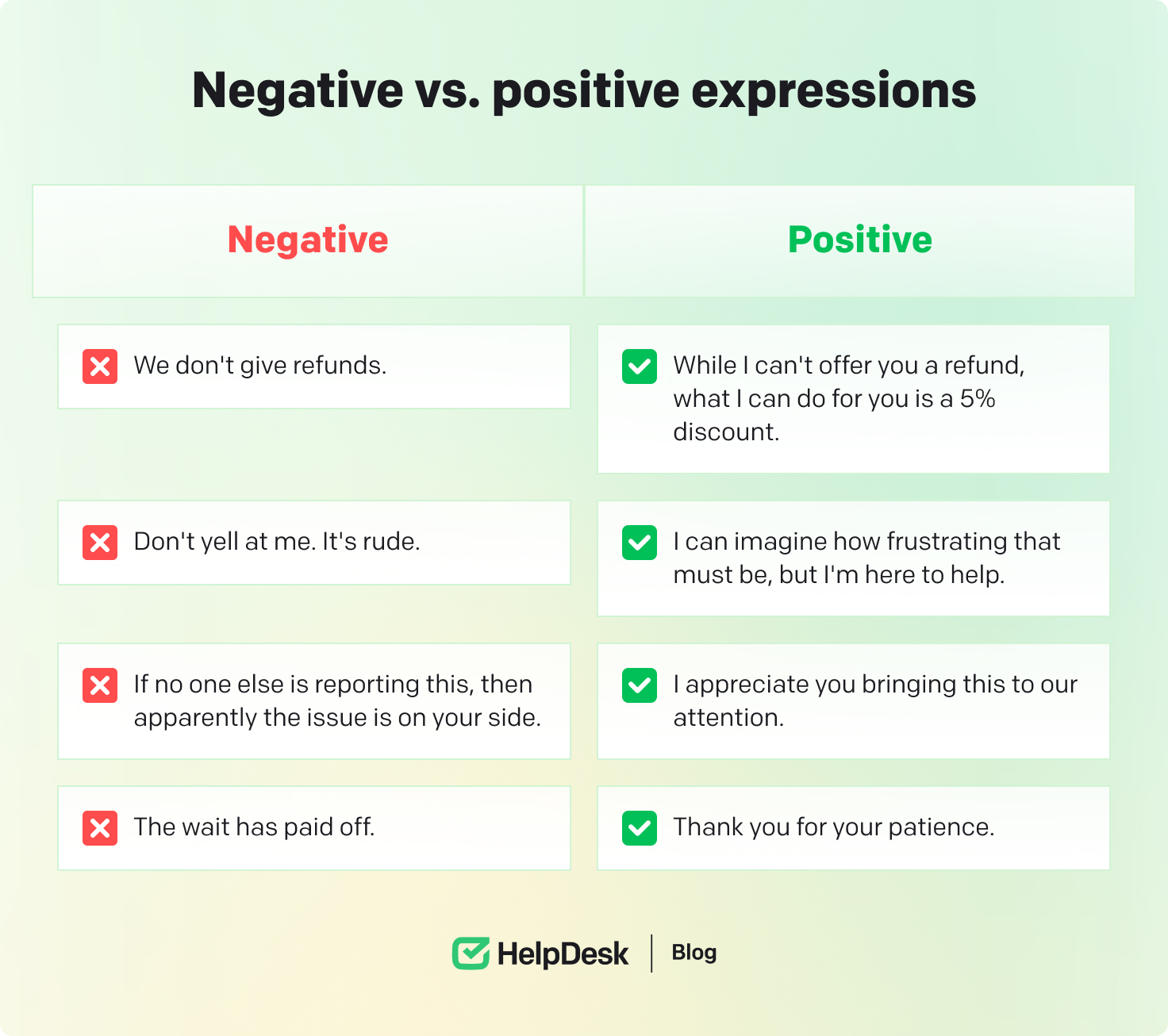 Instead of saying, “We don’t give refunds,” try, “While I can’t offer you a refund, what I can do for you is (particular action).”