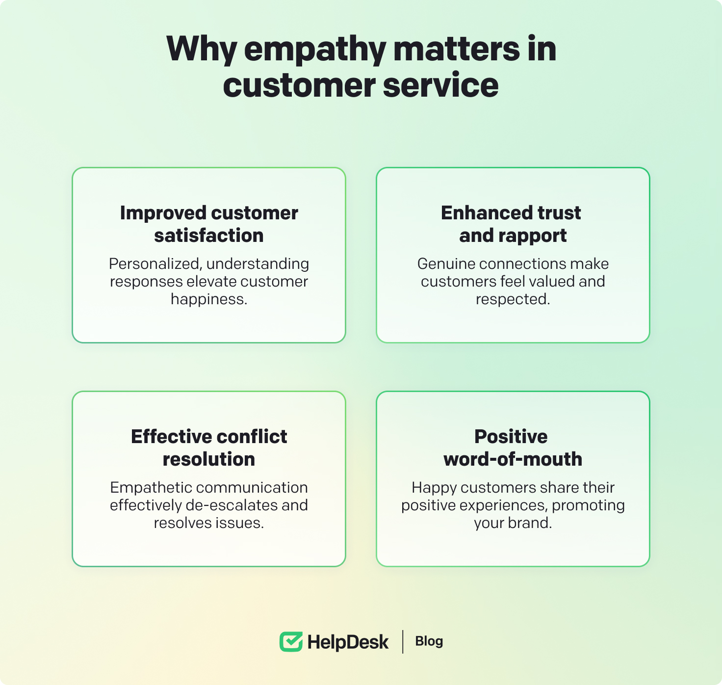 Empathy is essential for meaningful customer service interactions and long-term customer relationships. Being on good terms with your customers enhances their satisfaction and diffuses tense situations.