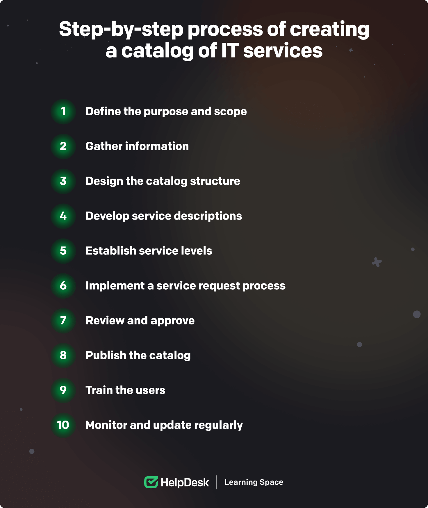 Creating an effective IT service catalog involves a series of methodical steps, each contributing to a user-friendly and informative resource. This catalog enhances the visibility of IT services and streamlines the process of accessing and managing these services. Below is a step-by-step guide outlining the essential processes for developing a comprehensive IT service catalog.