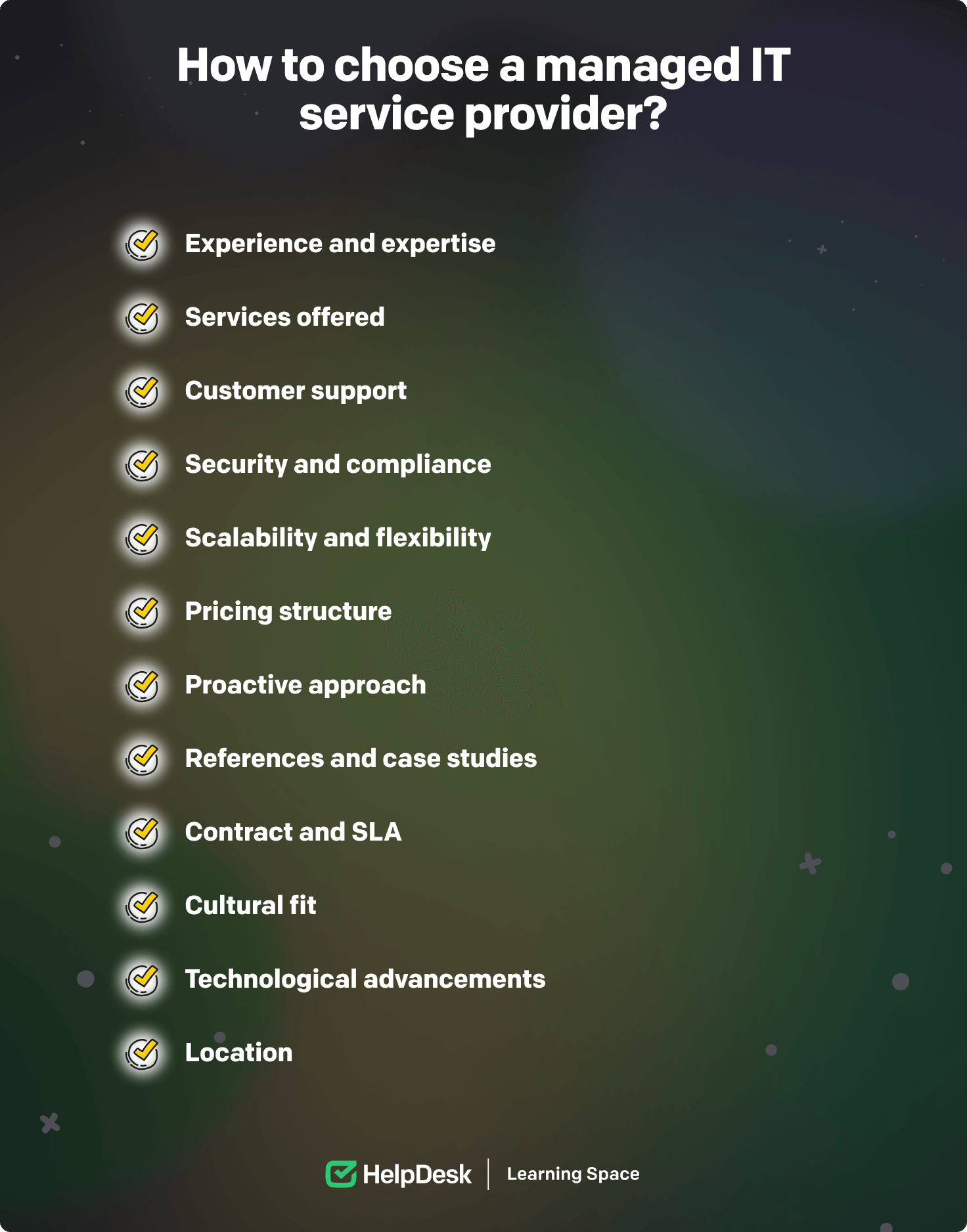 When choosing managed IT consulting service providers, consider their experience, quality of customer support services, and cultural fit with your organization. Evaluate their track record, adaptability to technology trends, commitment to security, and client testimonials. Aligning their values and communication style with your organization is key to a successful partnership.