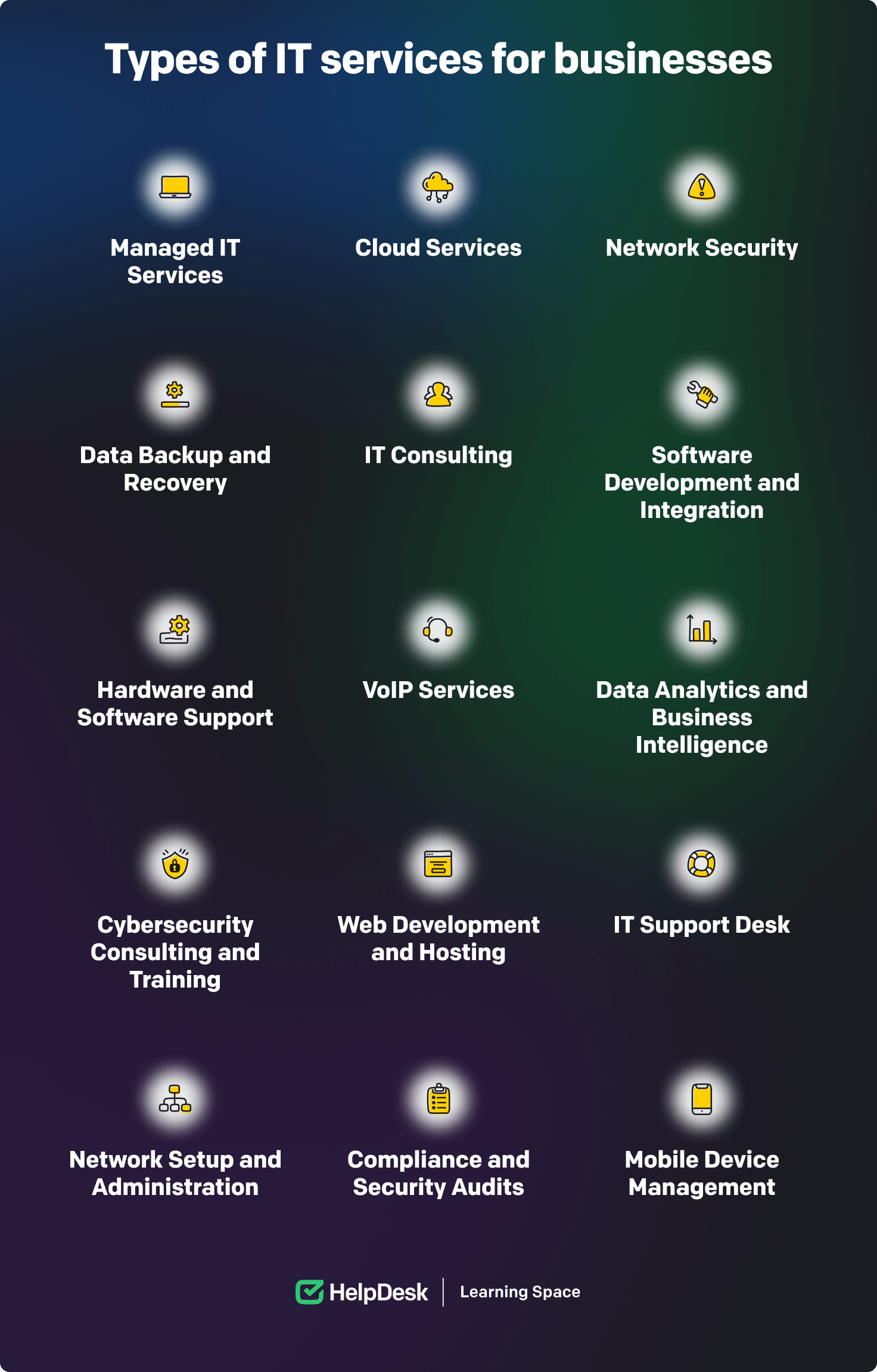 Each service offers unique benefits, and when combined effectively, they can transform an organization’s technological capabilities, driving growth and success in the digital era. Here are the types of IT services commonly used by businesses.