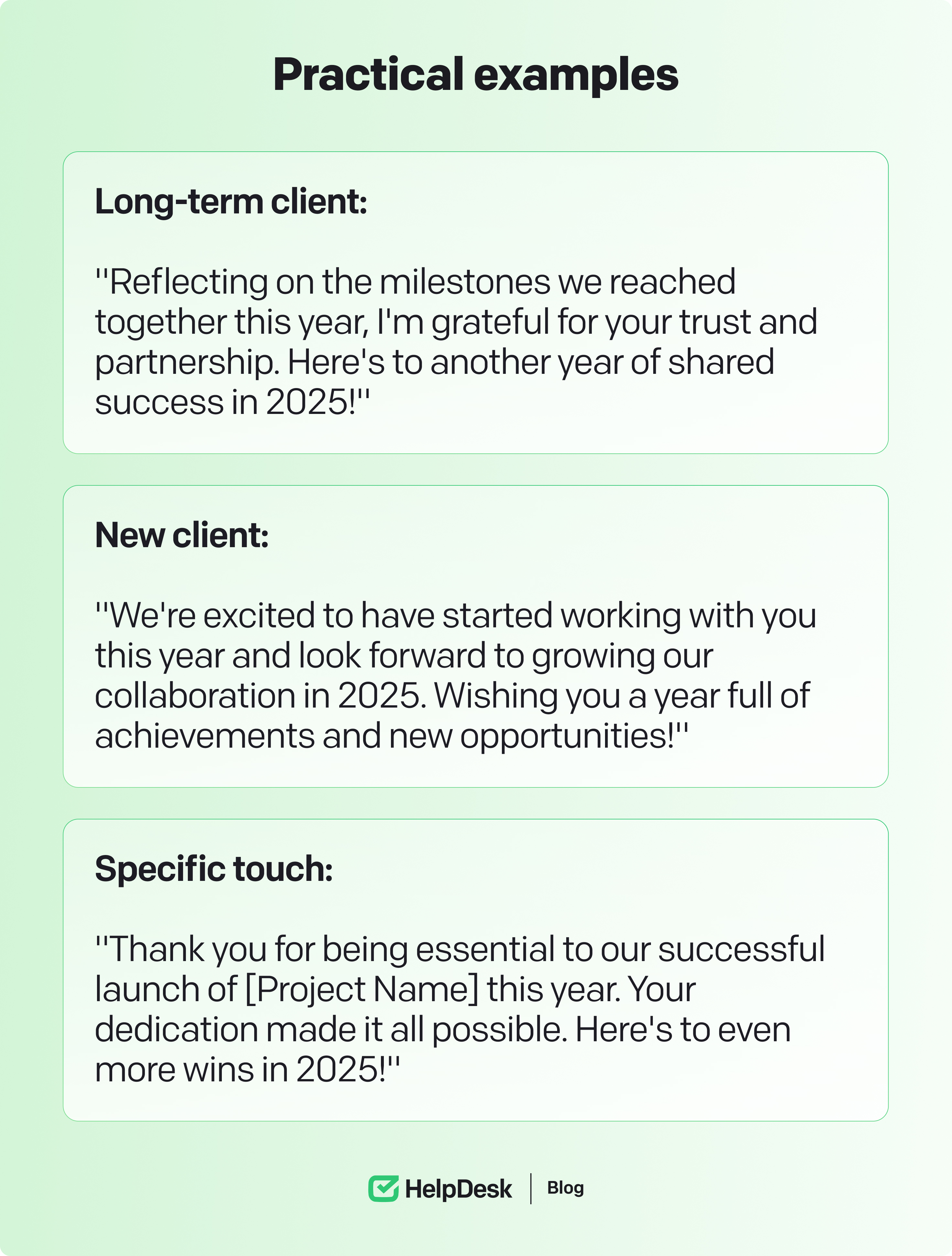 Personalized greetings remind clients that they’re more than just names on a list — they’re valued partners in your journey. A thoughtful wish shows you’ve taken the time to acknowledge their contribution and future with your business.